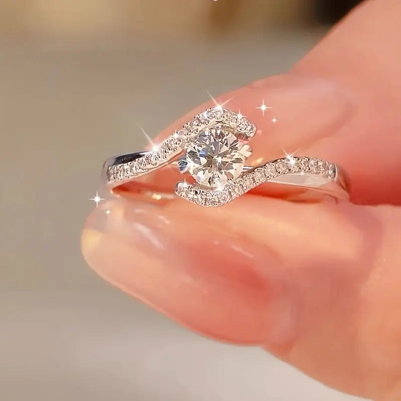 Crafted from 925 sterling silver, this romantic ring features a hollow twisted band and a four-claw circular setting, symbolizing connection, devotion, and unending affection.