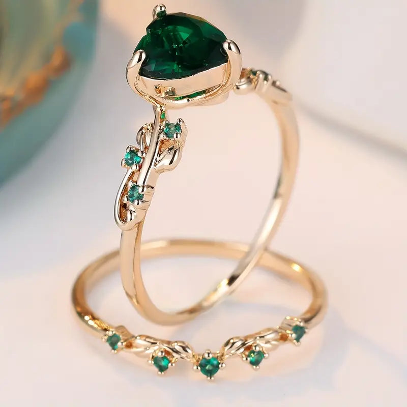 This 2-piece ring set features heart-shaped green synthetic zirconia stones paired with a warm golden-plated finish, offering a soft, elegant glow that feels both dreamy and refined.